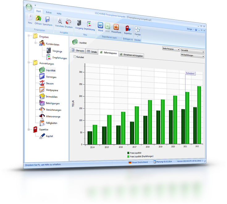 Der GSCHWIND Finanzplaner kompakt ermöglicht einen schnellen und einfachen Finanzcheck Ihrer Beratungskunden. Eine vereinfachte Erfassung bietet die Möglichkeit, die wichtigsten Daten auch direkt mit dem Kunden zusammen aufzunehmen. Hochrechnungen in den Bereichen Liquidität, Vermögen und Steuern liefern einen Überblick über die zukünftige Entwicklung. Die wichtigsten Kennzahlen der Anlagen und Verträge werden Ihnen in kompakten Aufstellungen zur Verfügung gestellt. Fünf Risikoszenarien sind ebenso darstellbar wie ein ausdifferenziertes Empfehlungsportfolio. Die Ausgabe einer hochwertigen Dokumentation rundet Ihre Planung mit dem GSCHWIND Finanzplaner kompakt ab.