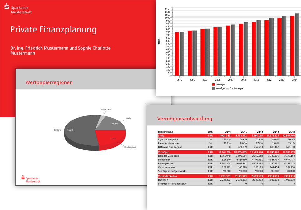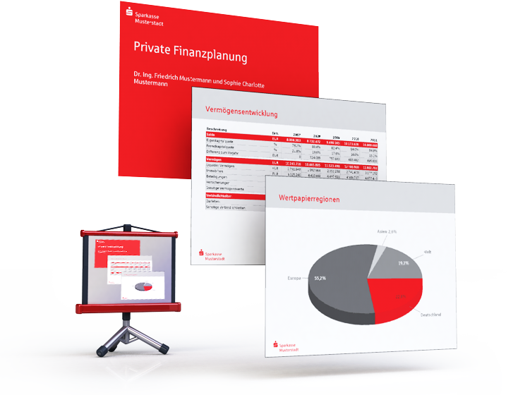 Ausgestattet mit denselben umfangreichen Funktionen, wie sie der GSCHWIND Finanz- und Nachfolgplaner beinhaltet, bietet der S-Finanz- und -Nachfolgeplaner von GSCHWIND zusätzliche Features. Diese richten die Premiumsoftware auf die speziellen Bedürfnisse von Sparkassen aus. Dazu gehören DSGV-spezifische Schriften, Farben und Layouts sowie Präsentationsmedien wie zum Beispiel Powerpoint-Dateien oder Dokumentationen im Sparkassen-Design.