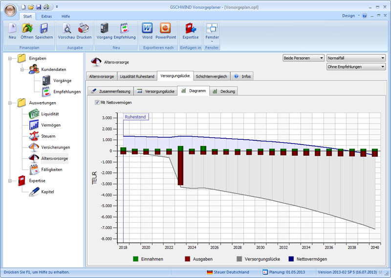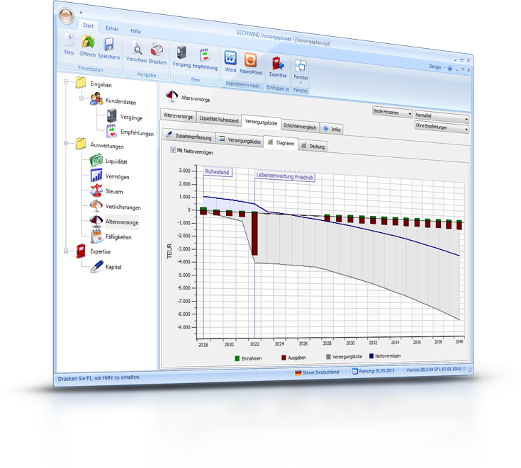 Der GSCHWIND Vorsorgeplaner stellt die drei Schichten des Alterssicherungssystems vollständig dar und bildet die gesetzliche, betriebliche sowie die private Altersvorsorge ab. Bei der Ermittlung der Versorgungslücke werden nicht nur ein Netto-Erwerbseinkommen mit einer Netto-Rente verglichen, sondern alle zu erwartenden Einnahmen und Ausgaben berücksichtigt, darunter auch Einkünfte aus Kapitalvermögen, Vermietung und Verpachtung sowie Aufwendungen für die Lebenshaltung, für weitere Vorsorgeaufwendungen oder Steuern.